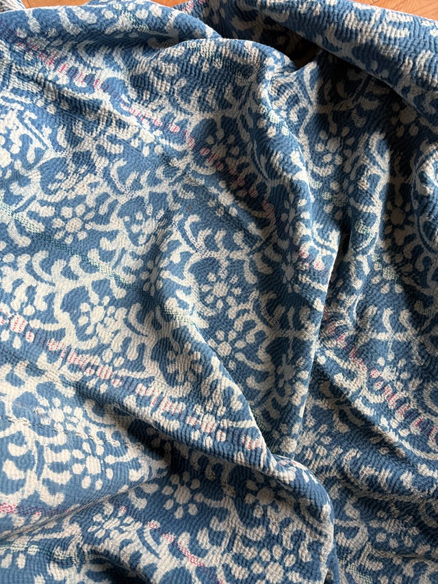 インディゴカンタキルトが初登場!! 藍染が魅せる色合いや模様 一枚一枚、人の手によって手間をかけて 仕立てられた布に さらに一針一針手縫いで 美しい刺繍が施されている 世界に一枚だけのキルトです。 両面違った雰囲気が味わえるので 一枚でも飽きることなく お使いいただけると思います。 ベッドカバー ソファカバー カーテンなどなど マルチカバーとしてお使いいただけます。 △お好みのサイズにカットして販売することも可能です。 お気軽にDMでご相談ください。 ※使用していくうちに布の端や面の部分が ボソボソしてきますが、気になるところは ハサミでカットしてご利用ください。 ∞∞∞∞∞∞∞∞∞∞∞∞∞∞∞∞∞∞∞∞∞∞∞∞ △素材:綿100% △サイズ:約130×約190cm(中央値) (測る場所により多少前後します。ご了承ください。) ※インドより直輸入 ※ホームクリーニング済 〔洗濯方法〕 ・ご自宅でお洗濯可能です。 ・ネットに入れて洗うことをおすすめいたします。 (心配な方はおうちクリーニングなどの機能がありましたら、そちらもご利用ください。) 〔必ず一読ください〕 ・ほころびやスレなどはこの商品の魅力と捉えております。 ・シミのあるものもありますが、どうしても落ちないものもございます。 ・場所により重ねている布の厚さが違う場合があります。 ・手仕事の為、歪みやサイズのズレ等もあります。 ・自然光で撮影していますが、実物と色のイメージのずれがある場合があります。 ・破れやシミなど見落としているものもある可能性があります。 ※インドの人たちのそれぞれの技術・個性、ありのままを楽しむ・味わうことを大事にしたいと思っています。 よく写真をご確認いただき、気になる点はお気軽にお問い合わせください。 商品の特性や魅力をご理解ご納得の上ご購入お願いいたします。