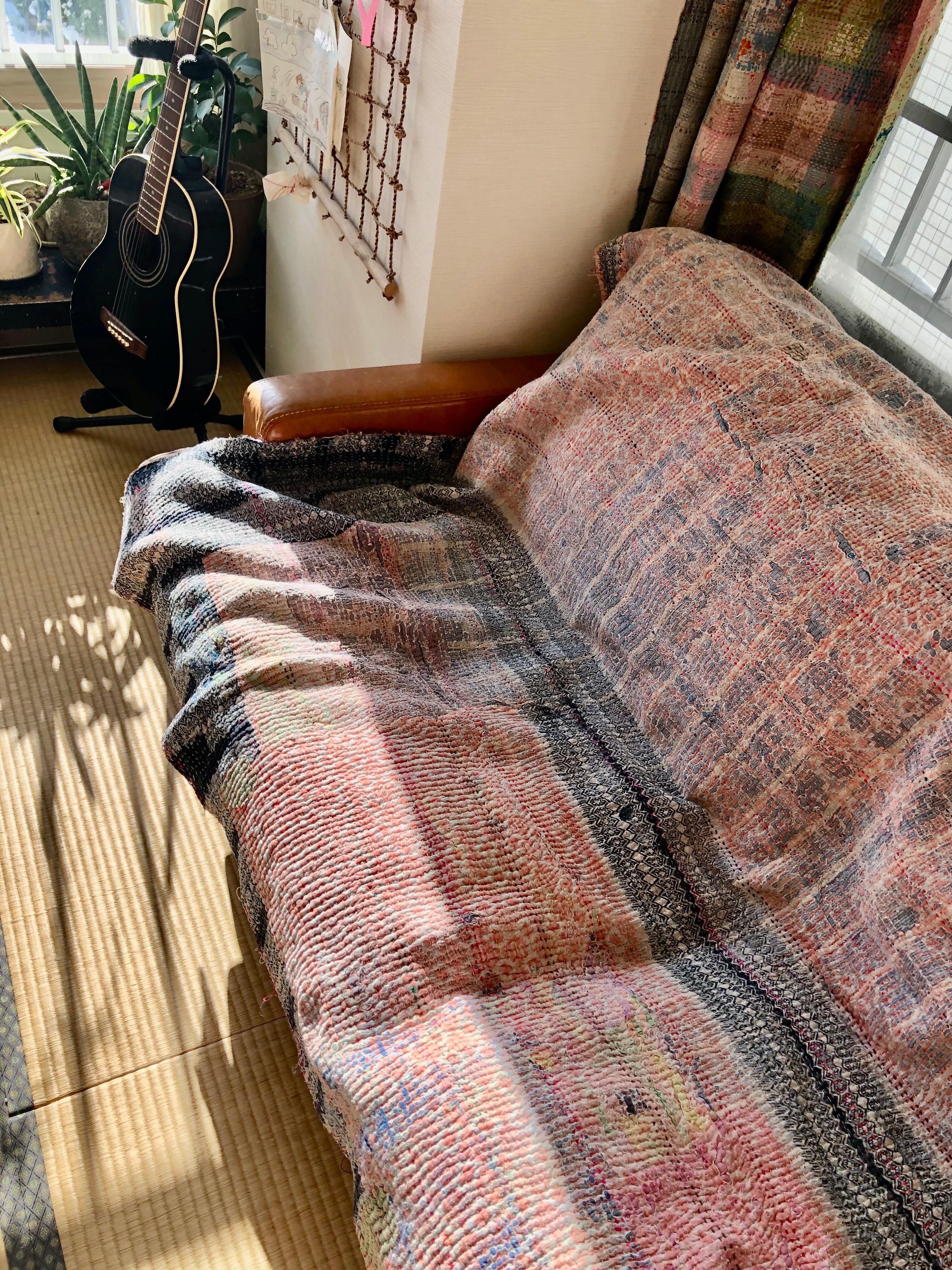 厚さ・重みは中間でラグとしてもベッドカバーやソファカバーなどマルチにお使いいただけると思います。