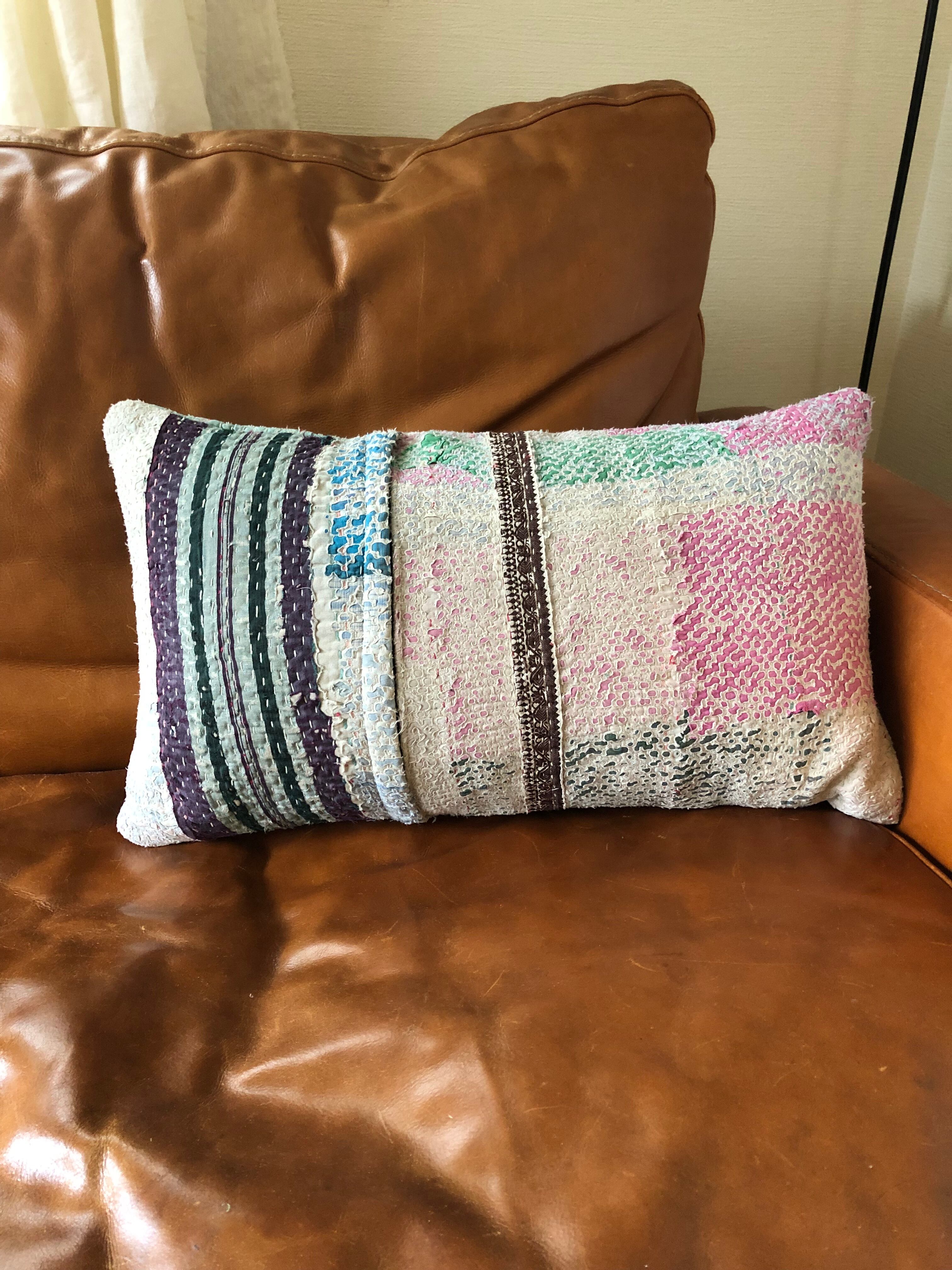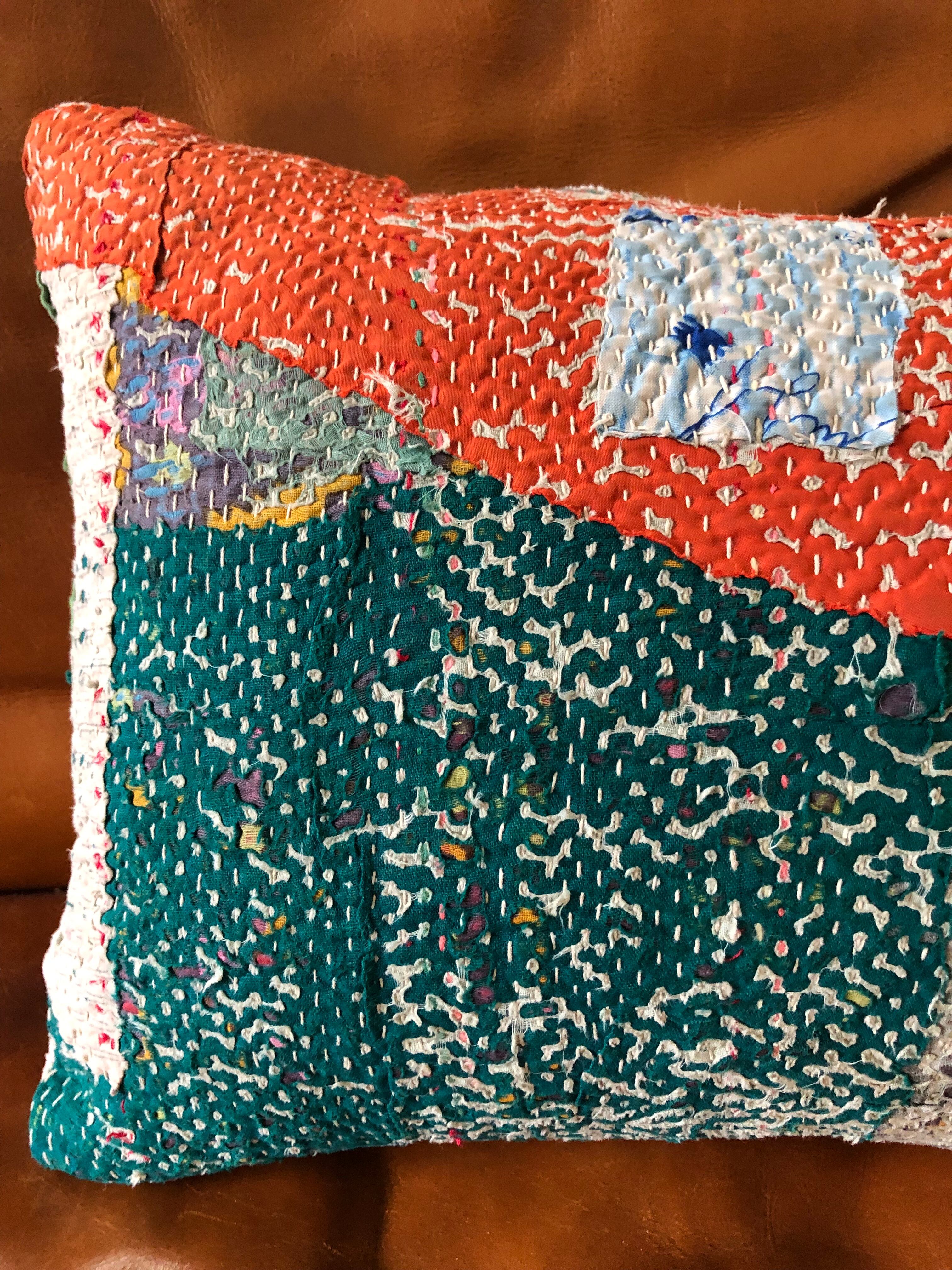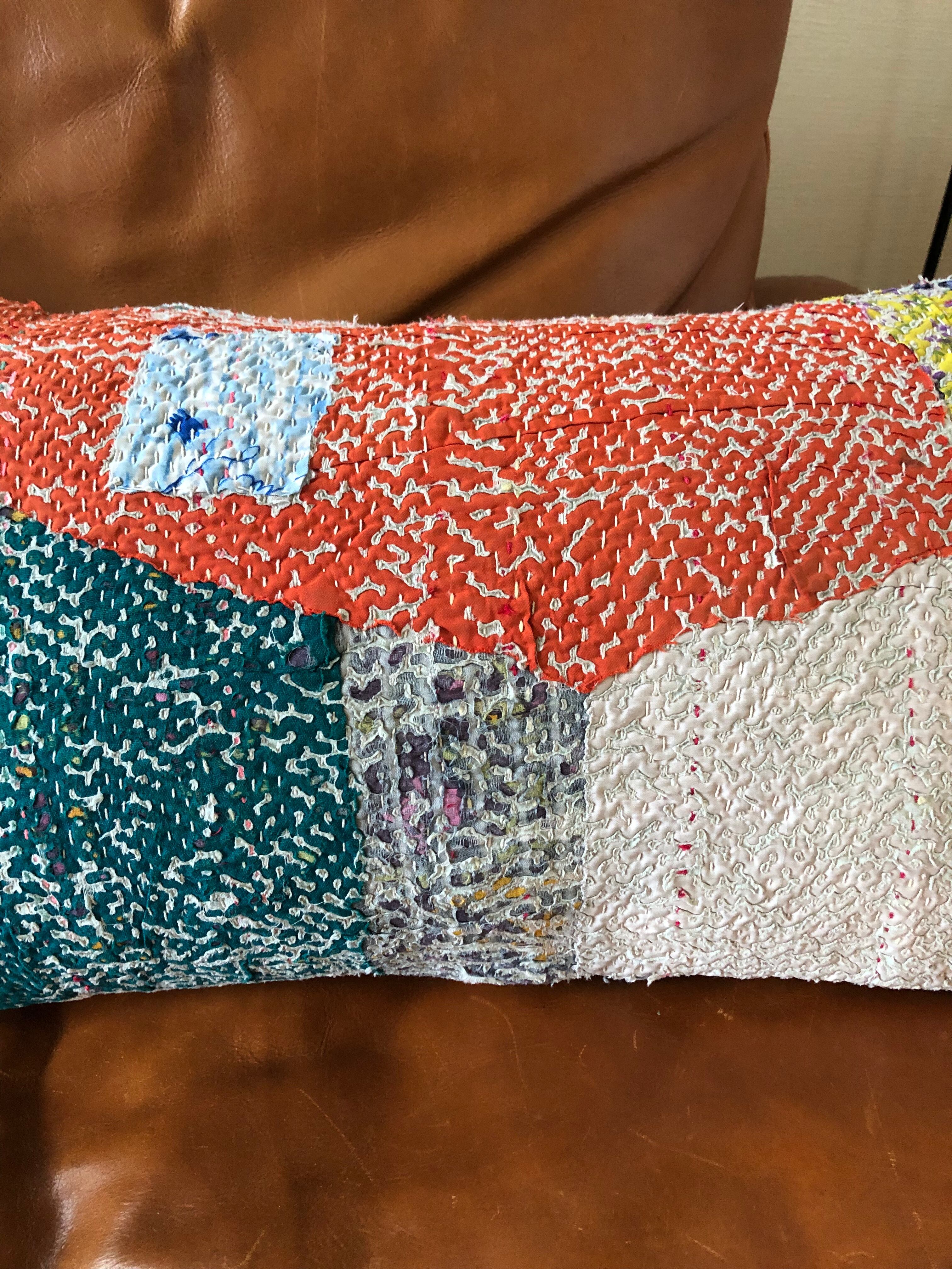 Vintage Kantha Cushion Cover 30×50 横長 orange×white pink (中身付)