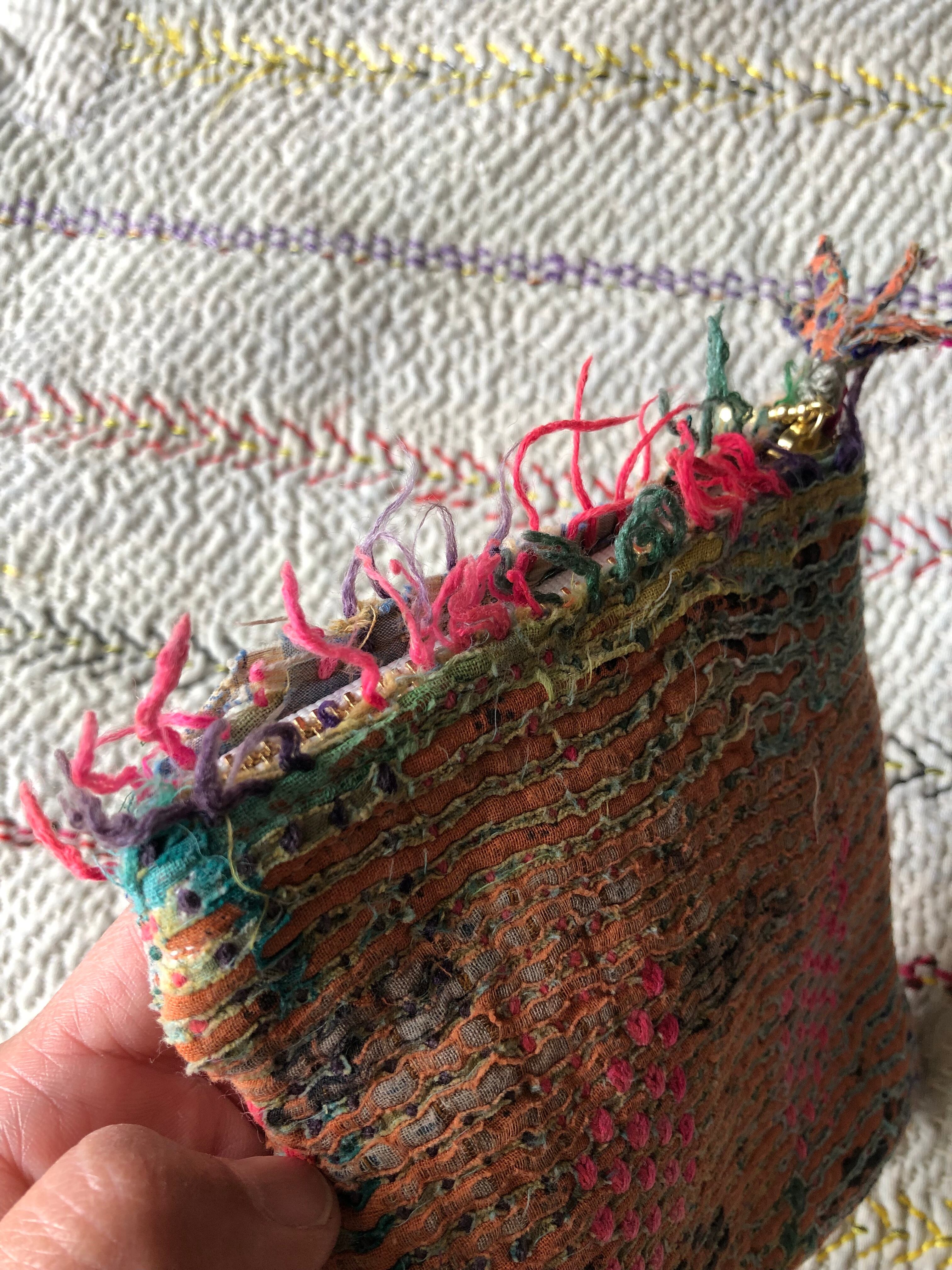 布の端から飛び出ている刺繍糸を