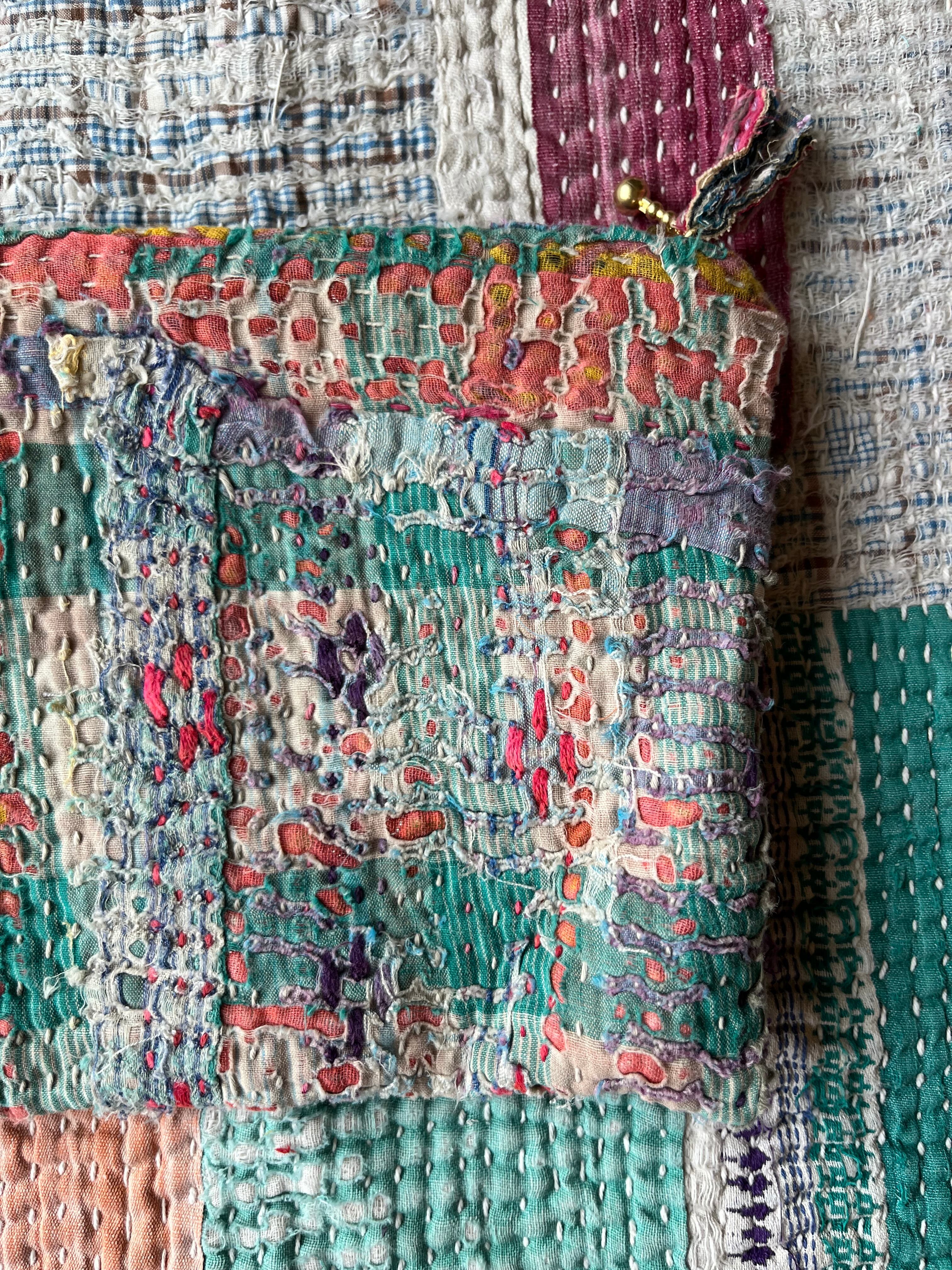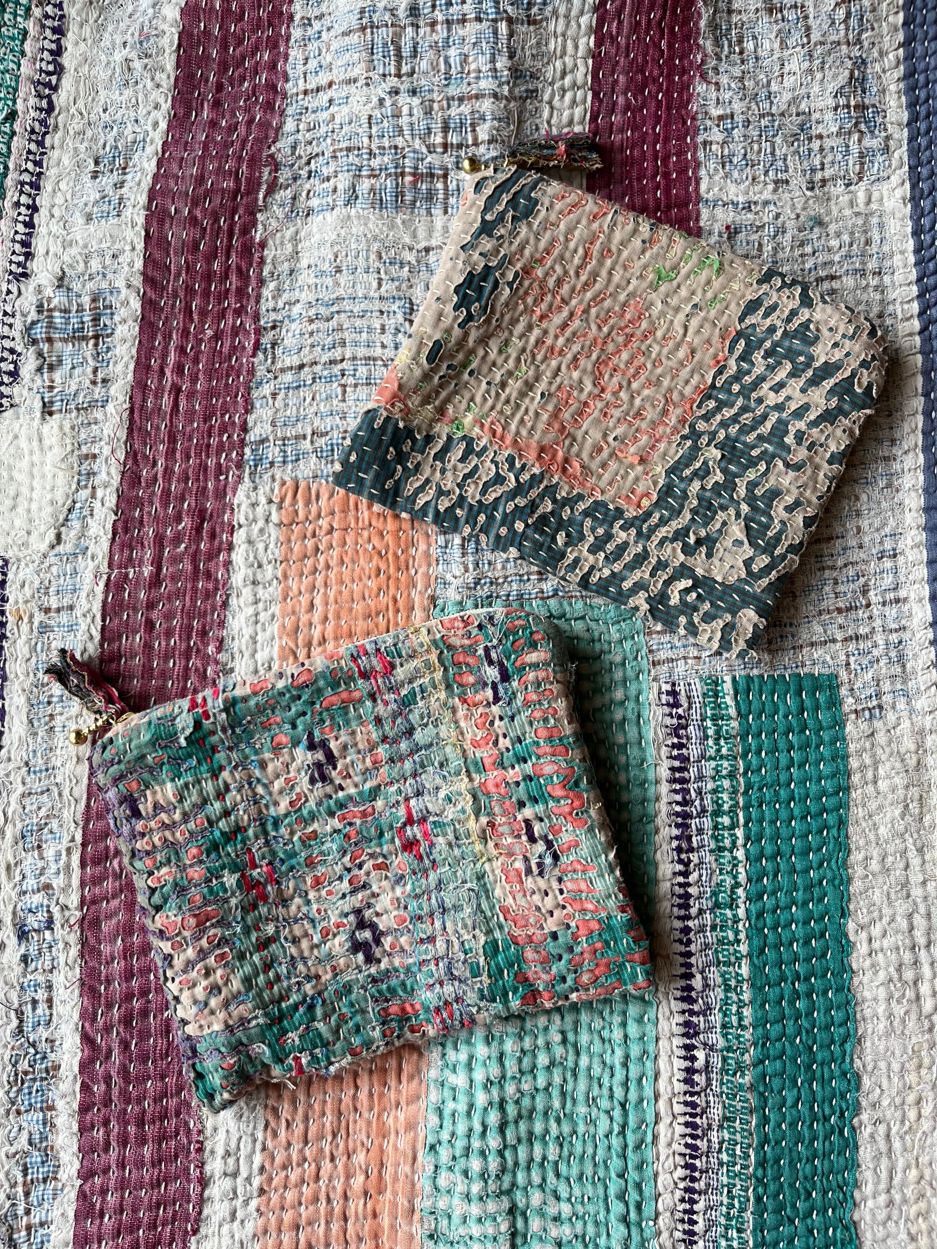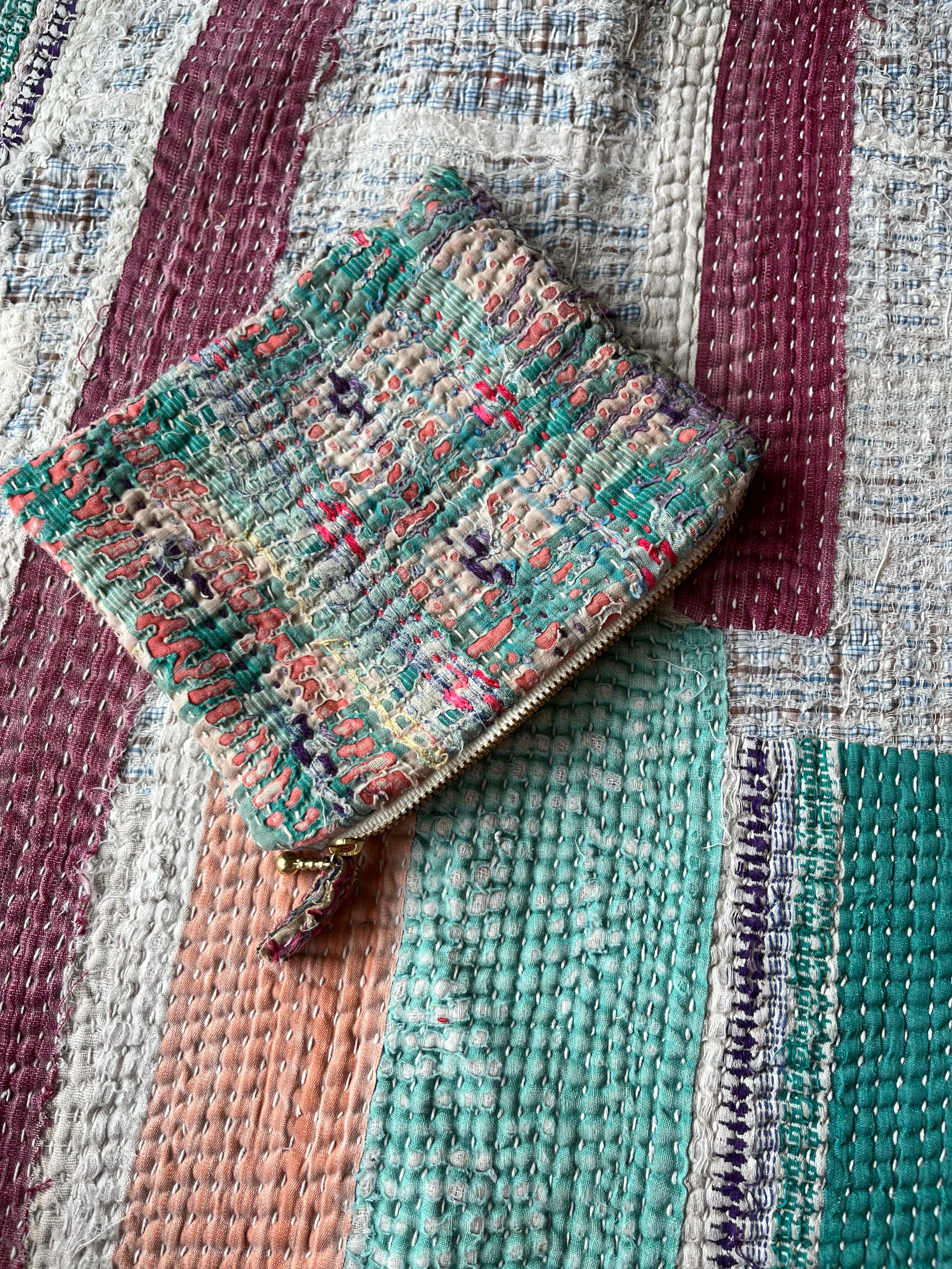 Vintage Kantha フラットミニポーチ Green×Pink mix