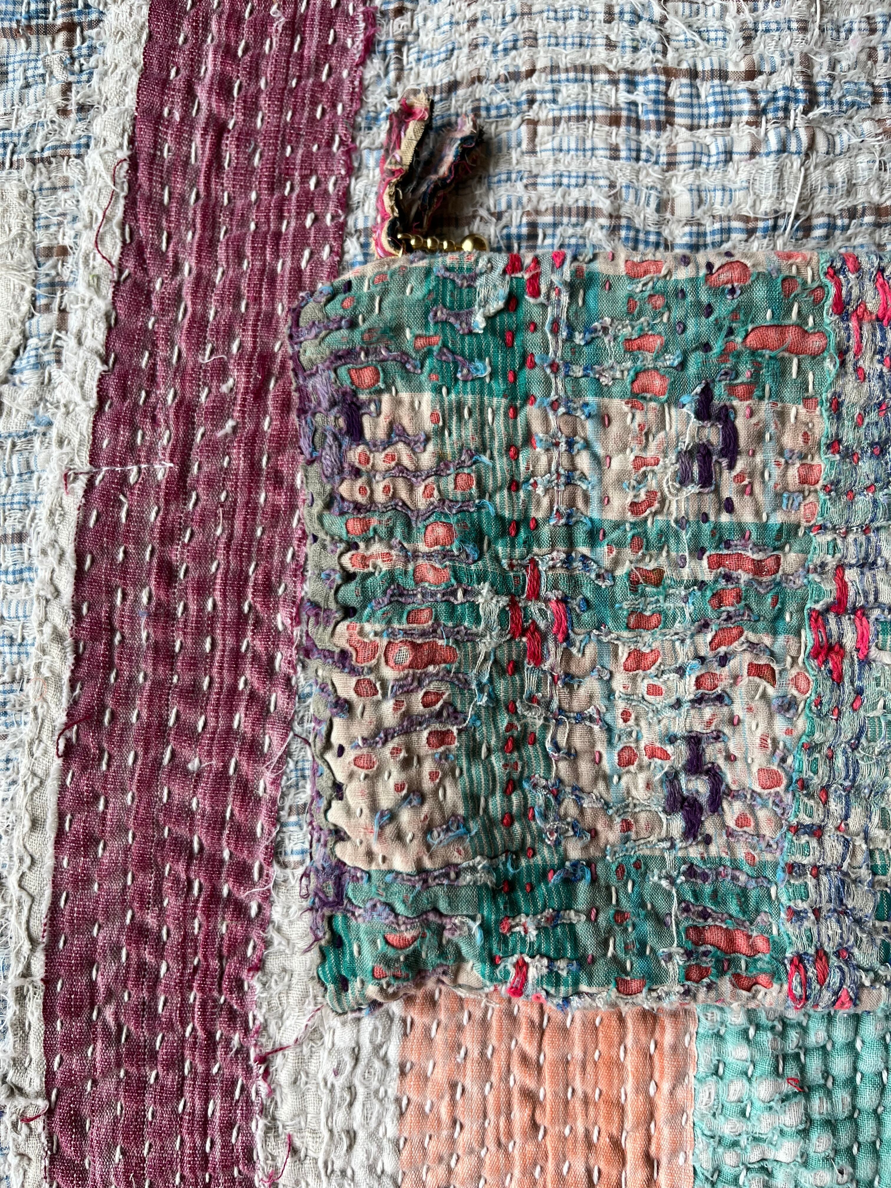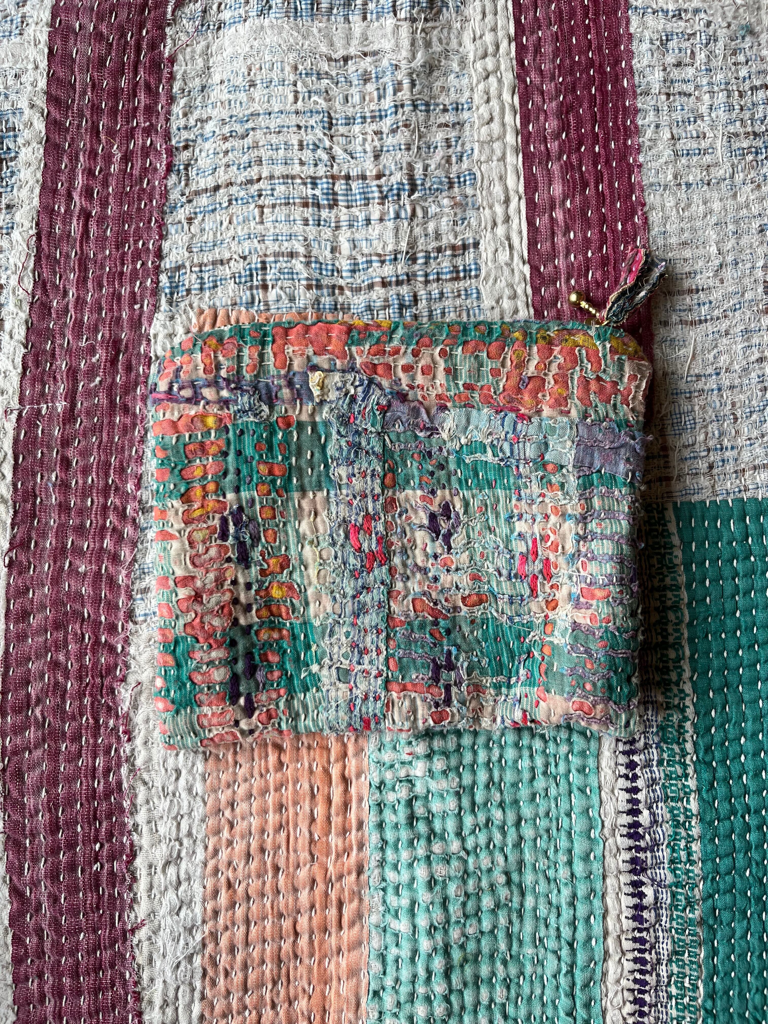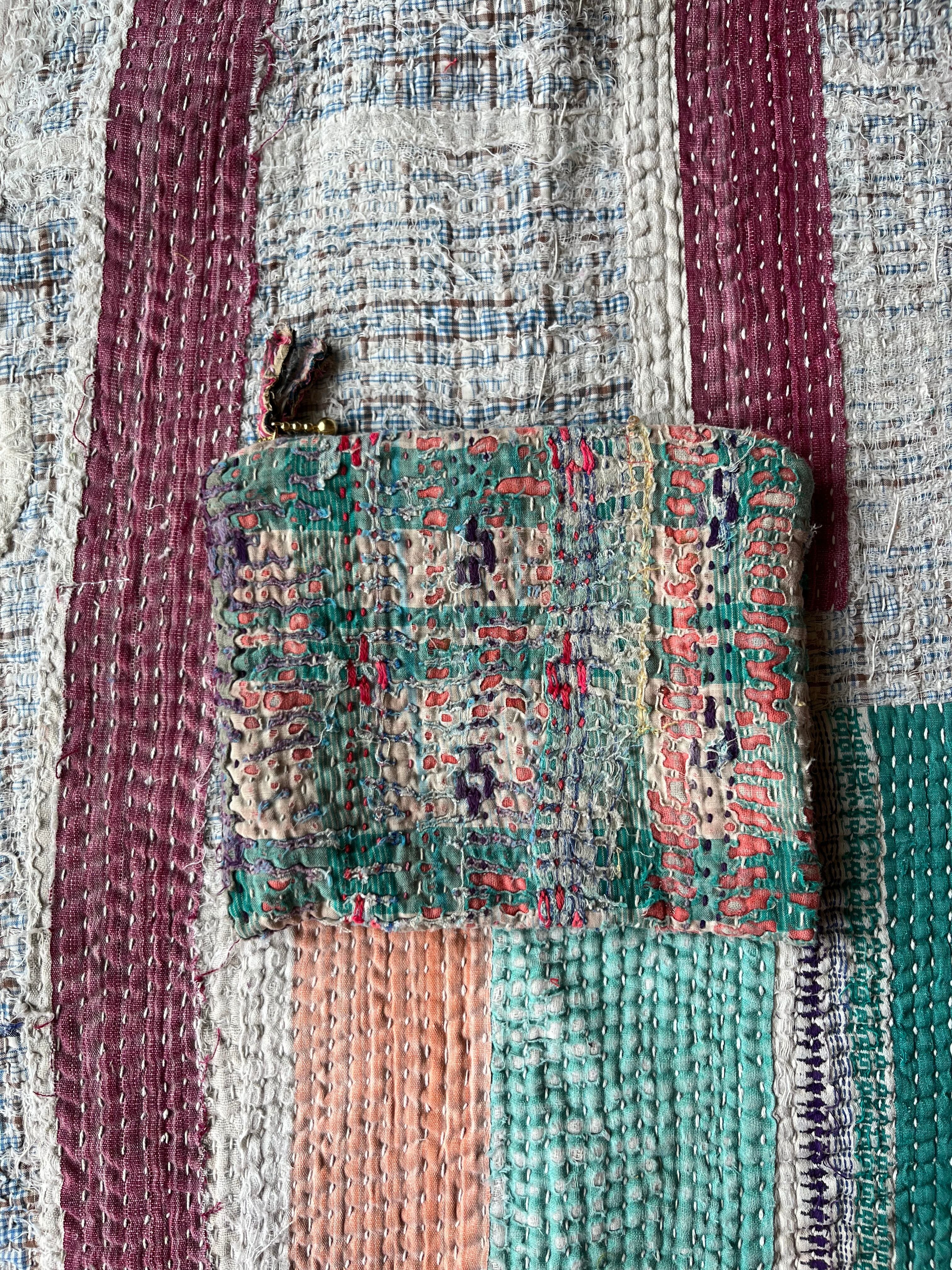 Vintage Kantha フラットミニポーチ Green×Pink mix